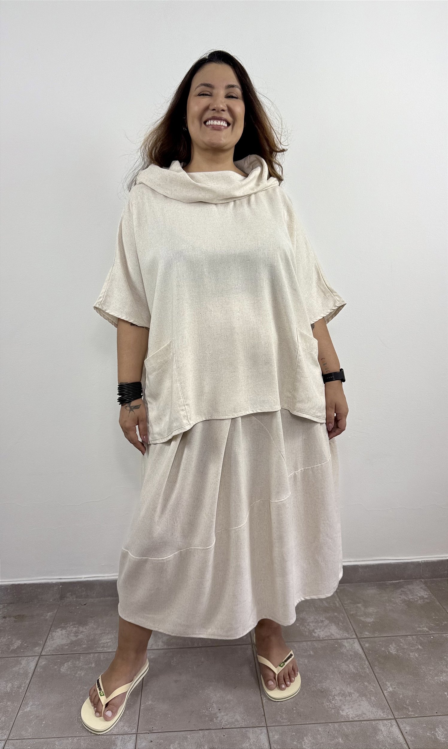 Inspirada nas roupas italianas, a Saia Itália possui recortes, pregas e elástico na cintura, garantindo conforto, fluidez e caimento perfeito. Confeccionada em linho e viscose, é moderna, elegante e atemporal.