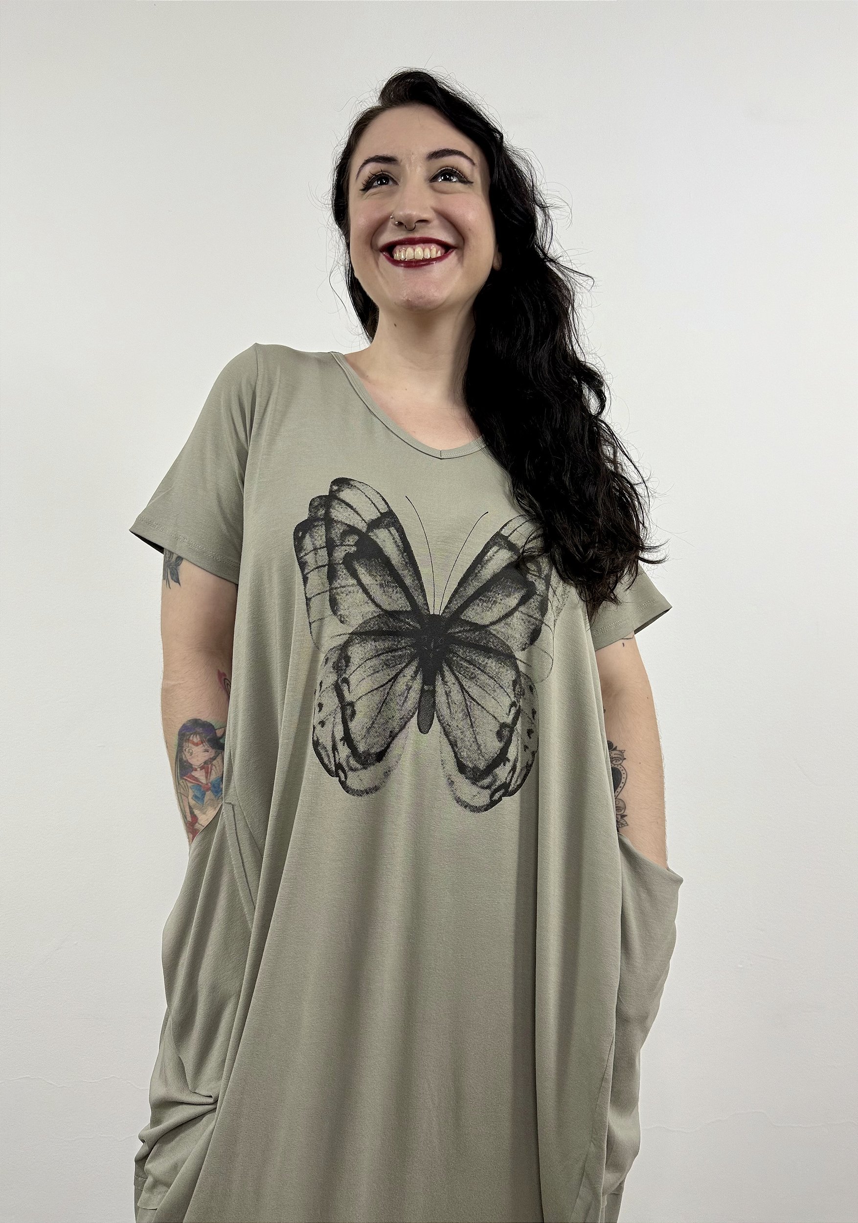 Observação: O Vestido Londres é um modelo bem solto, principalmente no quadril. As medidas são referentes ao ombro, então indicamos seguir a nossa tabela de tamanhos.