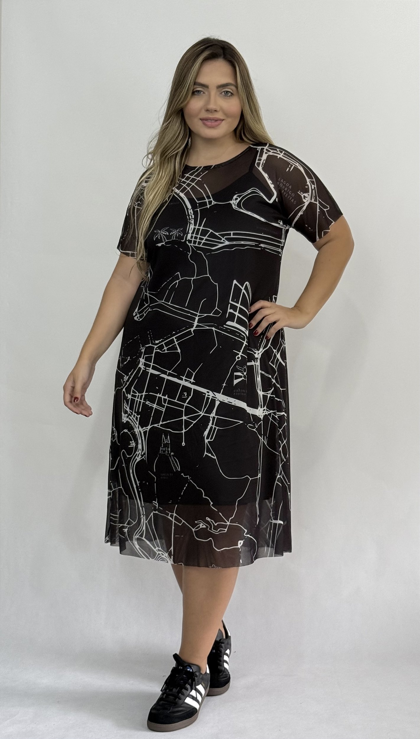 A modelagem segue o formato em A: mais ajustado na região do busto e progressivamente mais solto no quadril, criando um caimento fluido e sofisticado no corpo.