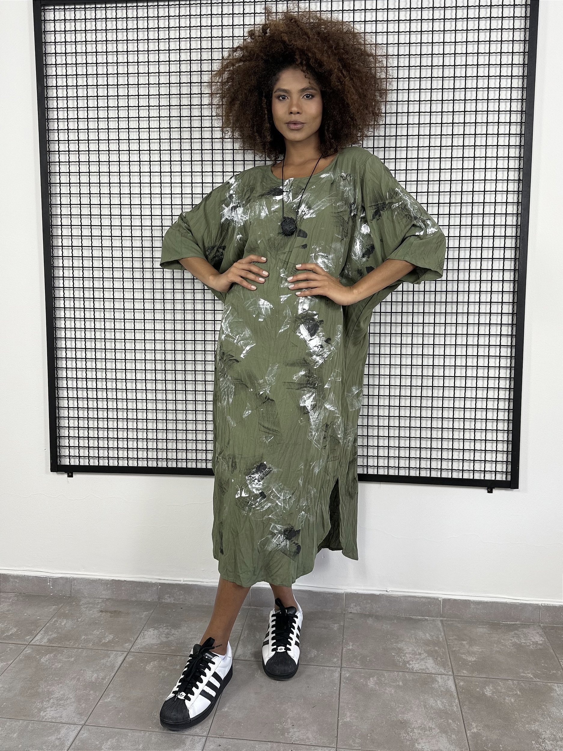 O Vestido Vitória traz manga raglan morcego para charme e leve cobertura, além de caimento solto e parte superior arredondada que alonga a silhueta. Elegante, fluido e versátil, é perfeito para mulheres modernas e confiantes.